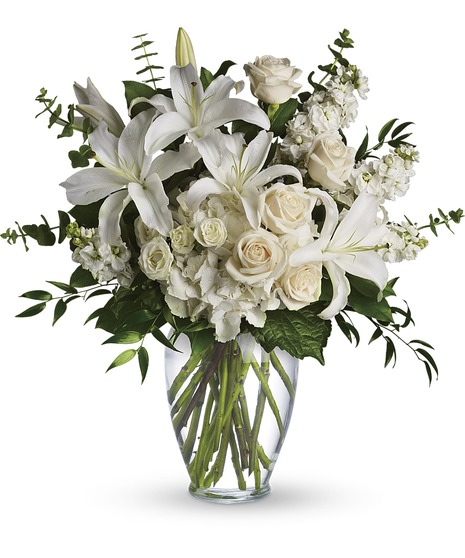 A dreamy bouquet of white sympathy flowers reminds you of your love. The lush arrangement of soft colors is delivered in a majestic, tall glass vase.