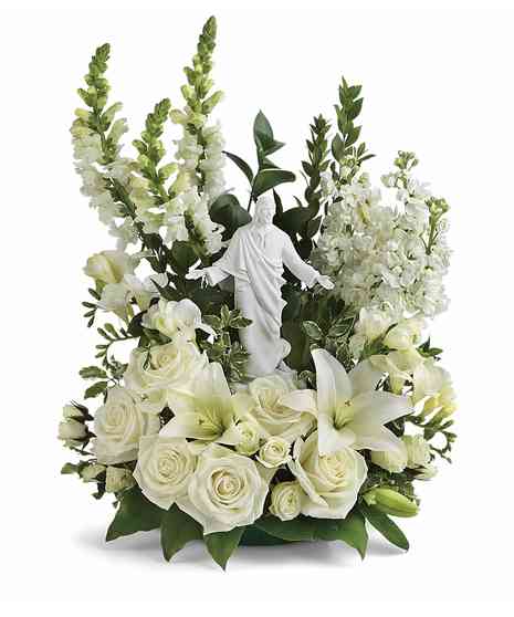 The Garden of Serenity Bouquet from Durocher Florist in Springfield, MA, is a profound expression of compassion and solace. It is a tranquil sanctuary in floral form, featuring an exquisite porcelain sculpture of Jesus, a comforting presence amidst a bountiful arrangement of radiant flowers. Elegantly poised, the purity of white blooms envelops this figure of peace and love. Creamy roses unfurl their petals in a gentle embrace, symbolizing reverence and honor. The star-shaped lilies extend their fragrant blossoms as if offering light in times of darkness. Towering snapdragons contribute to the arrangement's stature, representing grace and strength, while soft clouds of alstroemeria add a delicate texture to the composition.