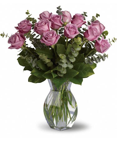 Lovely lavender roses are enchanting and exotic. They can even signify love at first sight, and when this pretty bouquet is delivered it will surely be love. Gorgeous as the roses are by themselves, when mixed with the dark forest green of eucalyptus the effect is intoxicating.