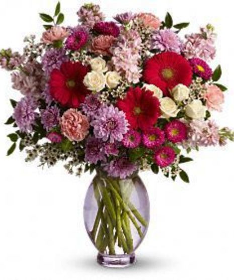 A celebration of springtime! This adorable arrangement mixes sweet and innocent shades of pink and soft lavender with excitingly hot pink gerberas. The result? A bouquet that's, well, perfectly pleasing – for nearly any occasion. There's lots of floral variety in this one: mums, stock, gerberas, roses, carnations, waxflower, plus dainty greens.
