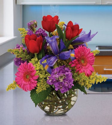 "Sensational Spring" from Durocher Florist in Springfield, MA, perfectly embodies the season’s vibrant beauty and renewal. Presented in a charming bubble bowl, this arrangement captures the essence of spring with its carefully selected blend of tulips, irises, and daisies. Each flower is chosen for its color and texture, creating a harmonious, eye-catching, and heartwarming display. The rich reds of the tulips blend beautifully with the striking blues of the irises, while the cheerful pink daisies add a pop of brightness. This bouquet is a sensational centerpiece for any Easter dinner table. Delicate sprigs of yellow solidago further enhance the arrangement, adding a subtle contrast and a touch of wildflower charm.