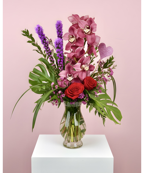 Our Tropical Love bouquet is a bold and romantic arrangement featuring striking pink cymbidium orchids paired with lush tropical greenery, including monstera leaves and flowing foliage. Designed in a clear glass vase and finished with playful Valentine heart accents, this modern arrangement brings a fresh, elevated twist to classic Valentine’s florals. Vibrant pink filler flowers add texture and movement, creating a dramatic yet elegant statement.